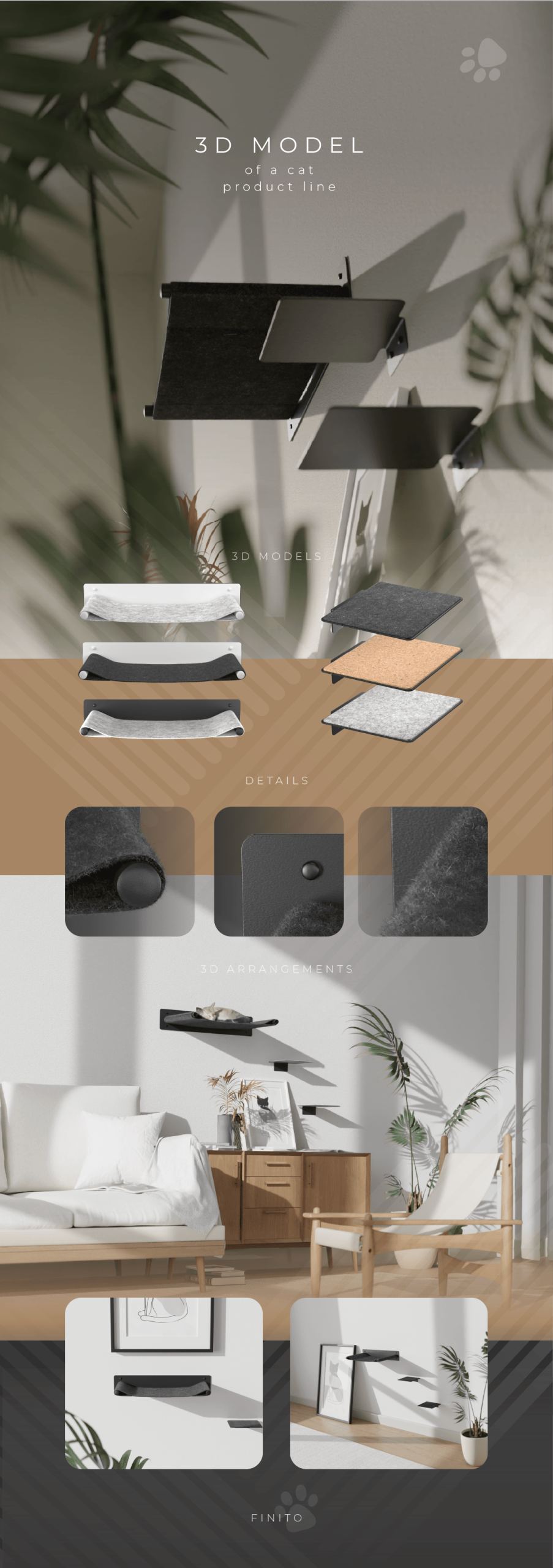 Celem projektu było przygotowanie wysokiej jakości wizualizacji 3D dla nowej linii produktów przeznaczonych dla kotów. Zadanie obejmowało stworzenie realistycznych modeli poszczególnych elementów (półki, legowiska, platformy), odwzorowanie materiałów oraz detali konstrukcyjnych, a następnie przedstawienie ich w różnych aranżacjach wnętrz. Dzięki temu możliwe było zaprezentowanie funkcjonalności i estetyki produktów w kontekście użytkowym, z naciskiem na nowoczesny i minimalistyczny design dopasowany do wystroju mieszkań.