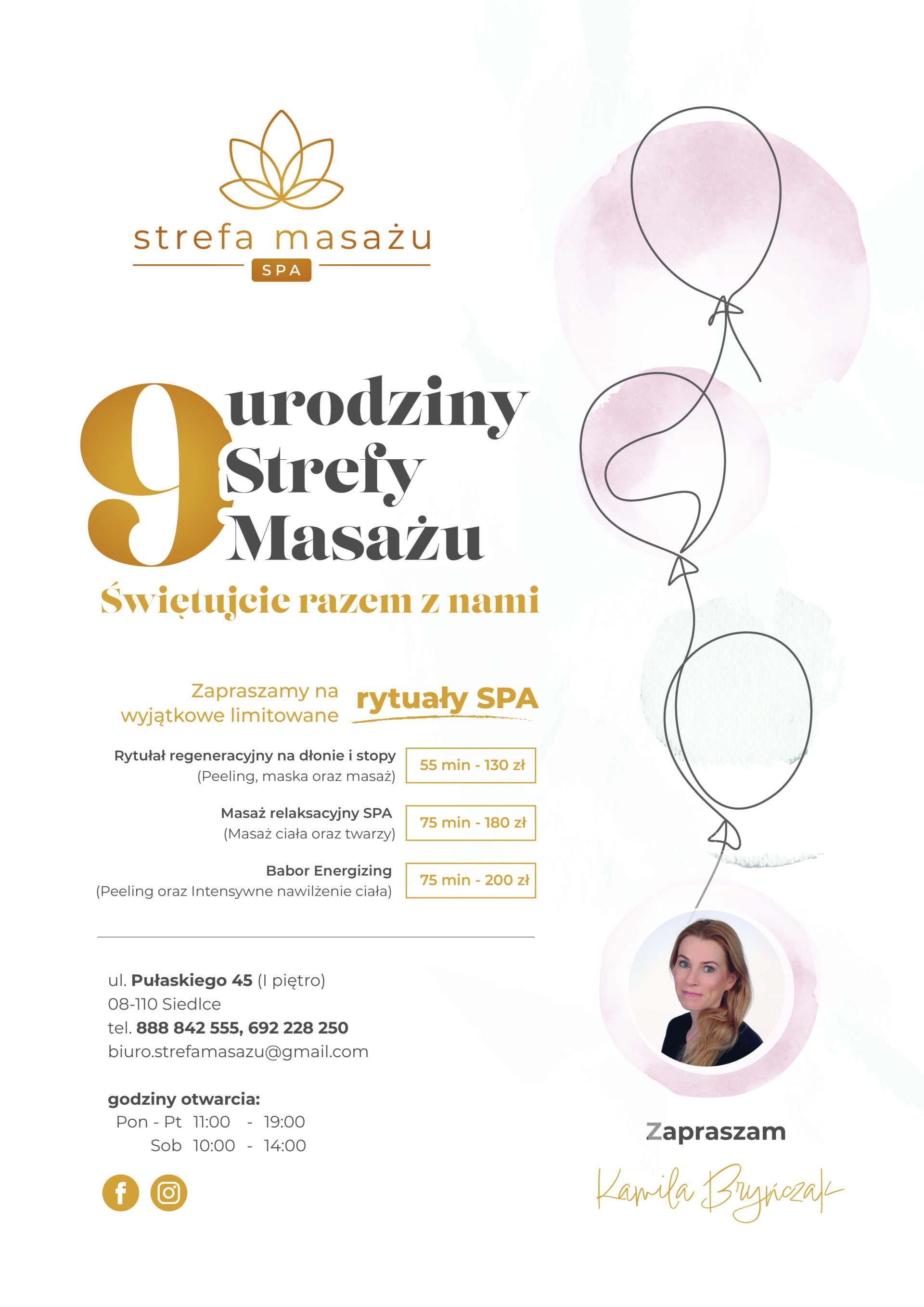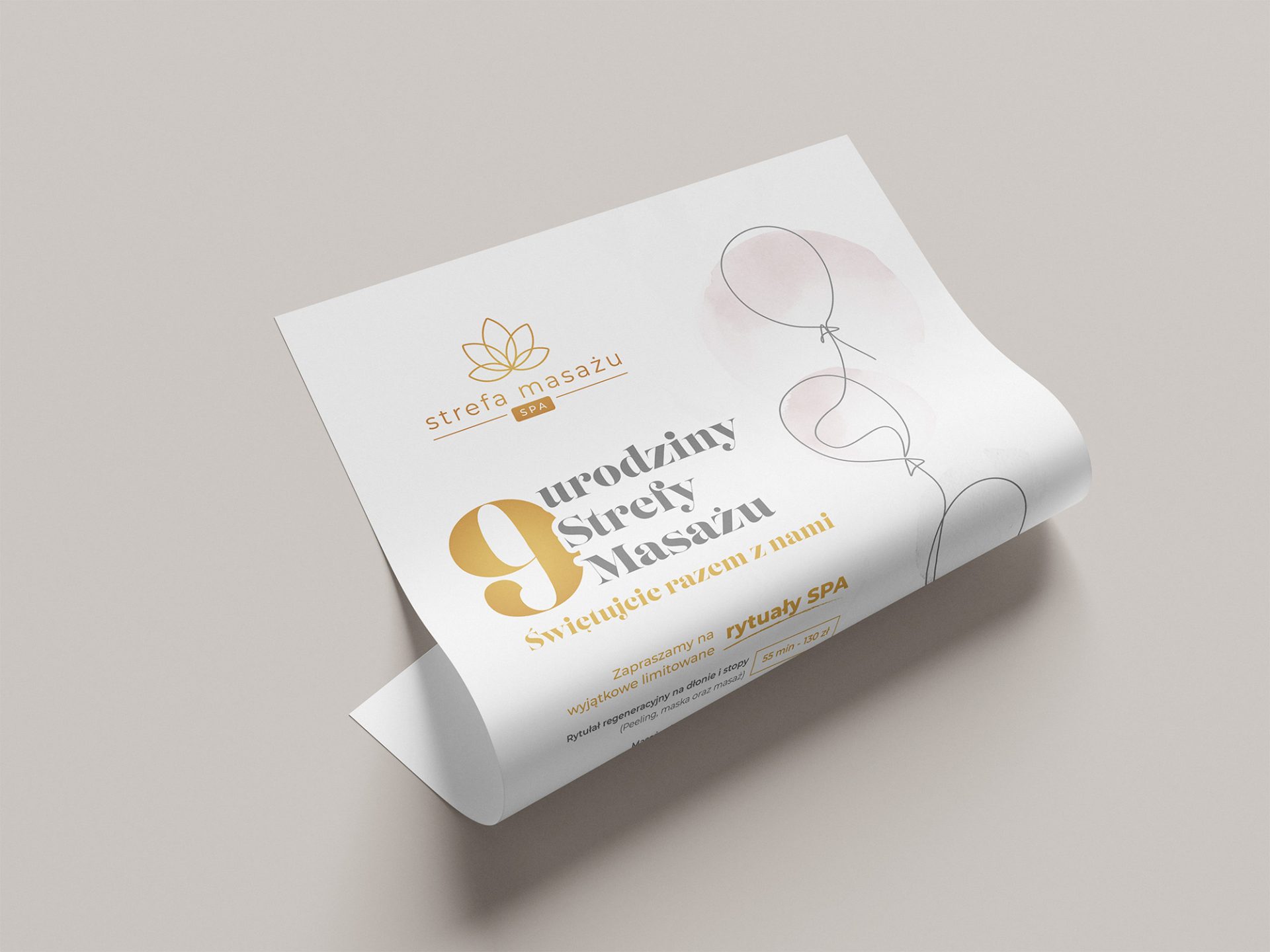 Zadaniem było przygotowanie plakatu promocyjnego z okazji 9. urodzin salonu „Strefa Masażu”. Celem projektu było stworzenie eleganckiej i lekkiej kompozycji graficznej, która w atrakcyjny sposób poinformuje klientów o wyjątkowych, limitowanych rytuałach SPA dostępnych w ofercie. Projekt miał podkreślać charakter marki – profesjonalizm, relaks i dbałość o detale – poprzez zastosowanie subtelnej kolorystyki, delikatnych ilustracji oraz spójnej typografii.