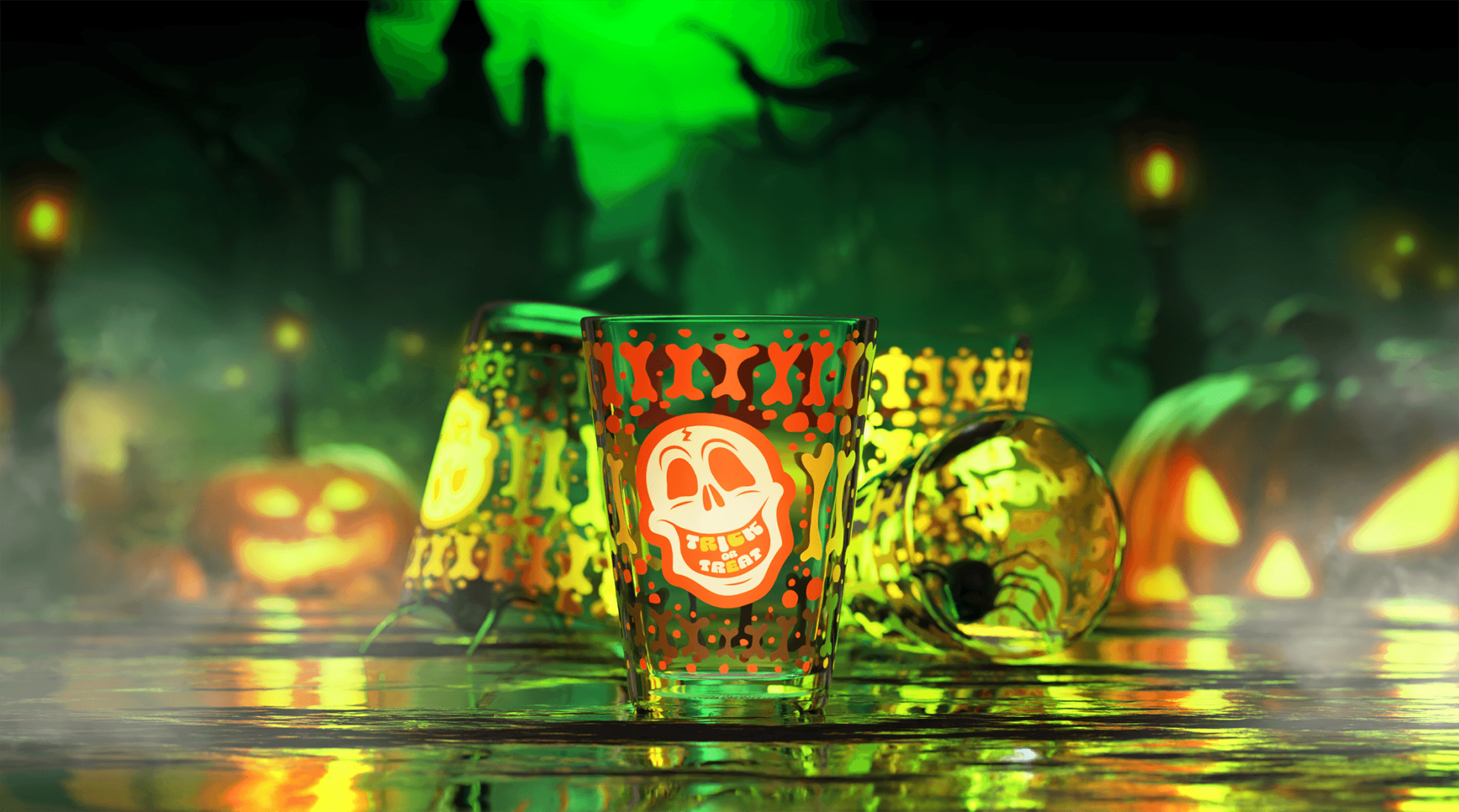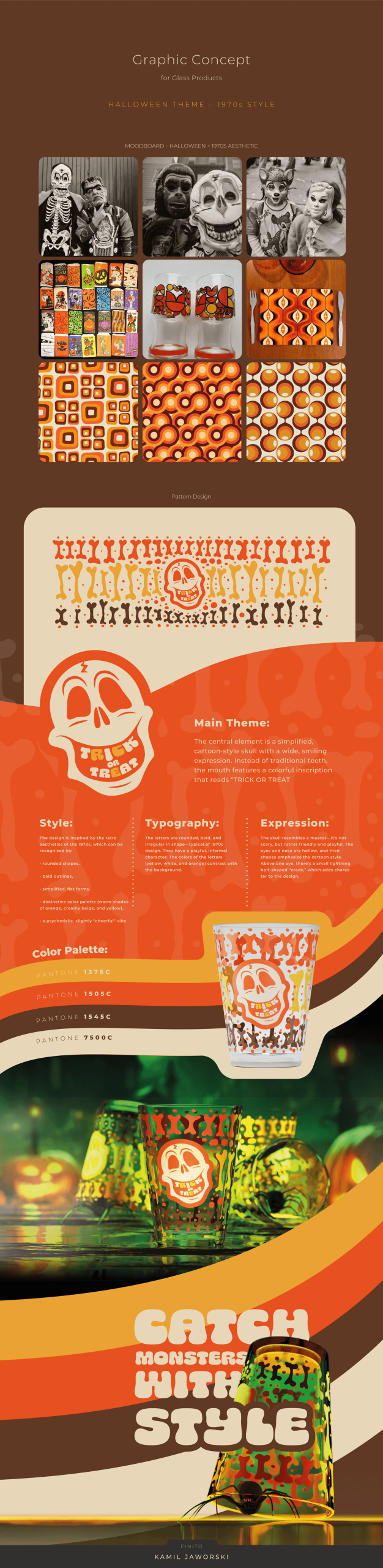 Celem projektu było opracowanie koncepcji graficznej dla produktów szklanych w klimacie Halloween, inspirowanej estetyką lat 70. Zadanie obejmowało przygotowanie moodboardu, stworzenie charakterystycznych wzorów i ikonografii oraz opracowanie spójnej identyfikacji wizualnej – od kolorystyki, przez typografię, aż po ilustracje. Kluczowym elementem było zaprojektowanie motywu czaszki w stylu retro oraz zestawu powtarzalnych wzorów, które mogłyby być wykorzystane w nadrukach na szklankach i innych produktach, tworząc efektowną, sezonową kolekcję.